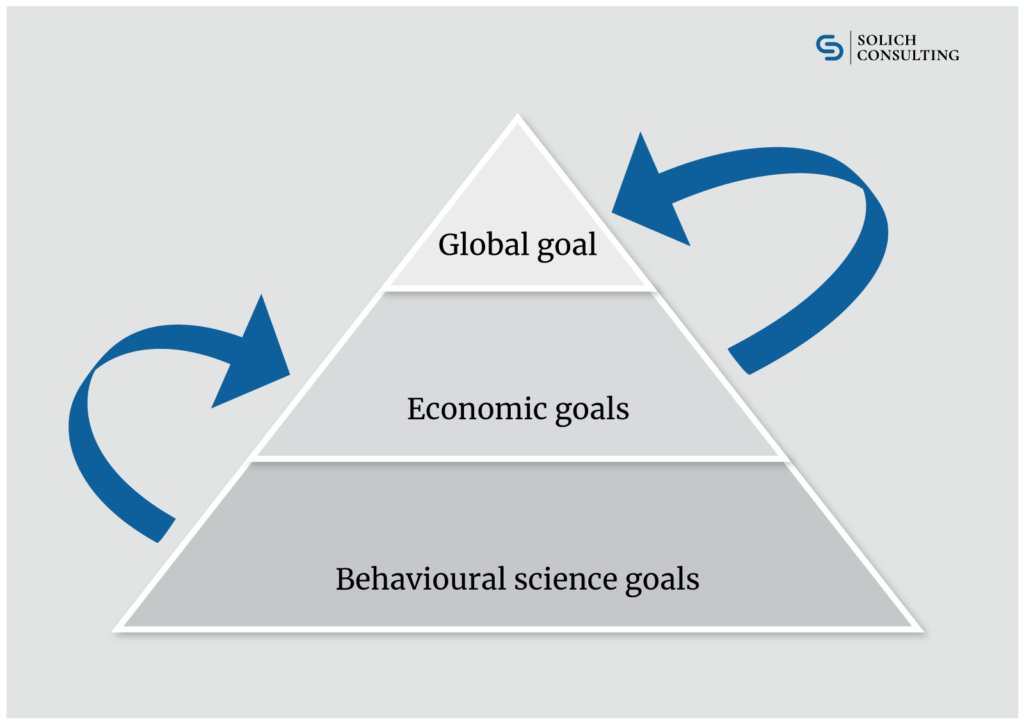 Both Sattler and Völckner[1] and Esch[2] see the development and increase of brand equity as the central objective of brand policy, which, from the point of view of behavioural science, “can be understood as the result of the different reactions of consumers to marketing measures of a brand compared to identical measures of a fictitious brand on the basis of specific brand ideas stored in the memory”[3] and thus builds on the findings of the corresponding theory. The evaluation as a central target value is based on the fact that the brand generates effects with consumers in terms of higher sales volumes and/or greater scope for pricing policy and that, consequently, higher turnover can be achieved, which allows the economic goals on the one hand and the overriding goals or the global goal of a company on the other hand to be achieved, as shown in the following target pyramid:[4]